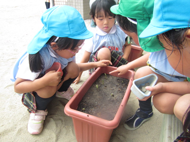 こどもたちは6月に種を植えてから、毎日水やりをし生長の様子を観察しています。時には『あさがお』の科学絵本を見ながら、「葉っぱが二つだから、今はこれじゃない?」と見比べたり、「棒を立てると良いんだって。」などと教え合ったりしています。