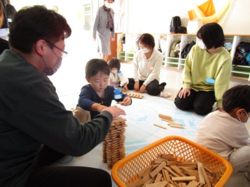 親子で「どんぐりはここにつける?」「落ち葉もつけたら素敵だね。」などと話をしながら、協力して作り進めていました