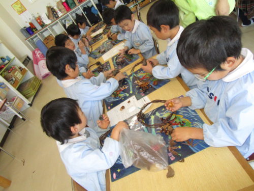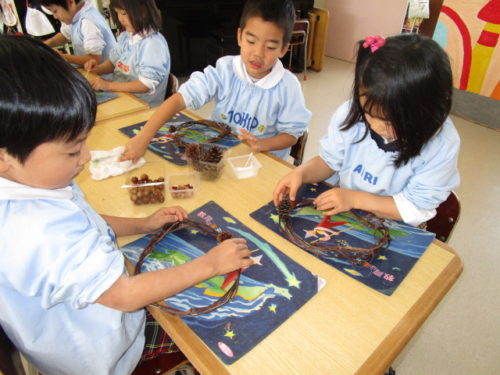 さつま芋の蔓を編み込み、しばらく乾燥させたものにこどもたちが持ってきた松ぼっくりやどんぐりを飾り付けました。凹凸のあるリースに松ぼっくりやどんぐり付けることに苦戦しながらも、それぞれが工夫しリースを飾り付けることを楽しんでいました。