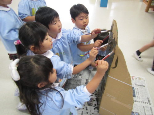 今日はオペレッタのお話の中で使う大道具や装飾物をみんなで作りました。こどもたちは「ちゃんと端っこまで塗るんだよ!」や「これ、かぶるの楽しみだね♪」などと話しながら製作をし、発表会に向けて期待を膨らませていました☆