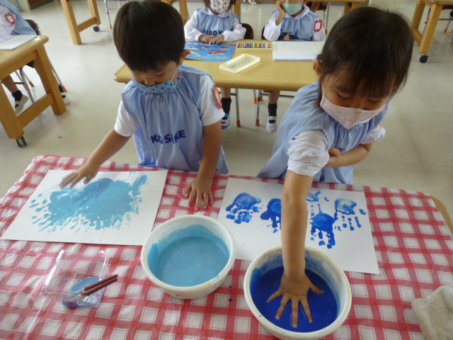 こどもの国幼稚園の年少組のこどもたちが手や指に直接絵の具をつけて絵や模様を描く活動をしました。