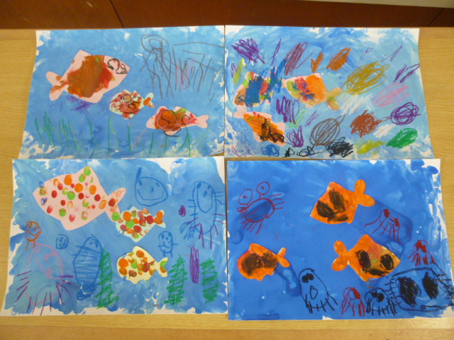 絵の具が乾いた後にはのりをつけて画用紙に貼り、周りにたこやかになど海の生き物の絵を描くなど、海の世界を表現することを楽しんでいました。