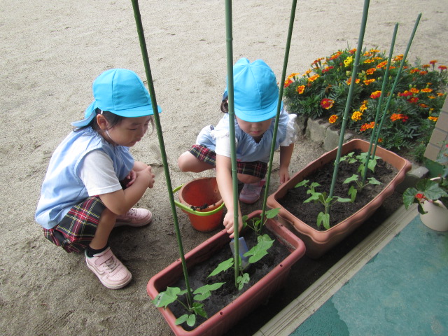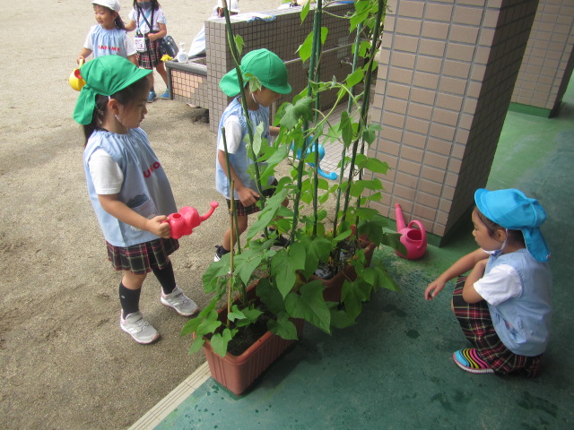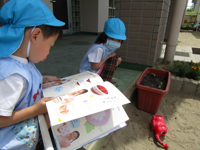 こどもたちは6月に種を植えてから、毎日水やりをし生長の様子を観察しています。時には『あさがお』の科学絵本を見ながら、「葉っぱが二つだから、今はこれじゃない?」と見比べたり、「棒を立てると良いんだって。」などと教え合ったりしています。
