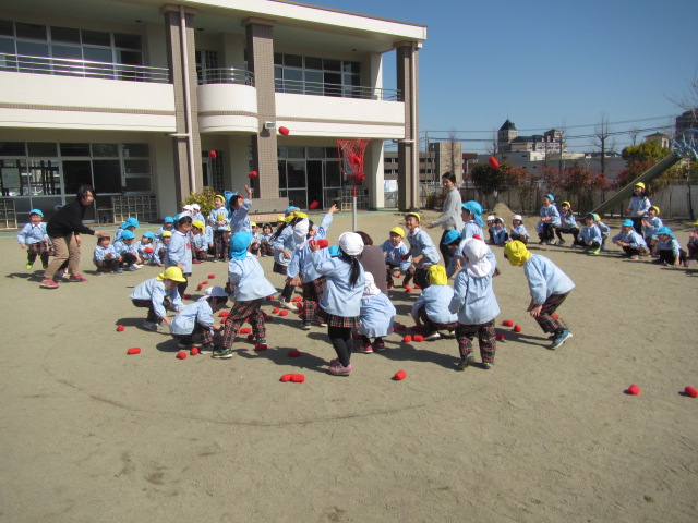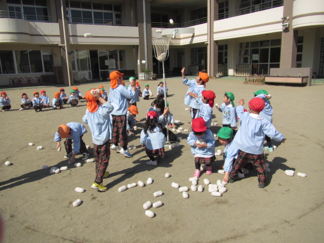 その後は、園庭に全園児が集合し、玉入れや仲間集めゲームをして楽しみました。クラスの枠を超えて友達に声をかけながら共に遊ぶ楽しさを味わうことができました。
