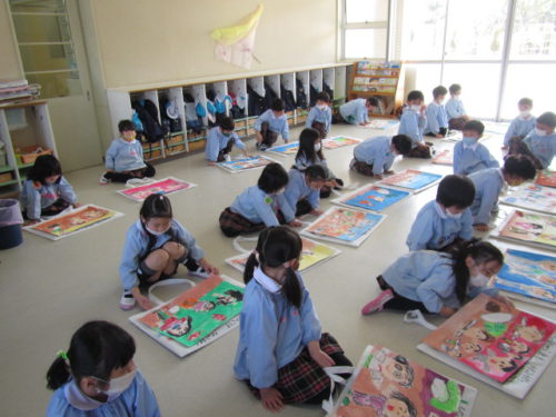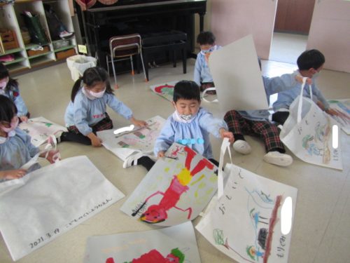 年中組で、これまで描いてきた絵を作品バックに収める活動をしました。こどもたちは一年間で様々な経験画や観察画を描いたり、当番表を作ったりしてきました。