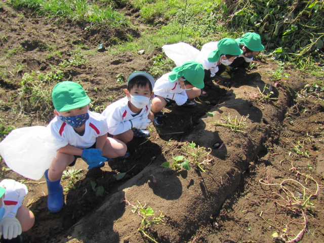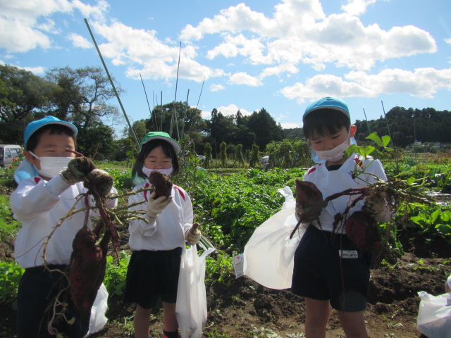 さつまいも掘りが始まると、土を手で掘ることに苦戦しながらも一人一人が一生懸命掘り、たくさんのさつまいもを収穫することができました。中にはこどもたちたちの顔ほどの大きさのさつまいももあり、とても嬉しそうにしていました。
