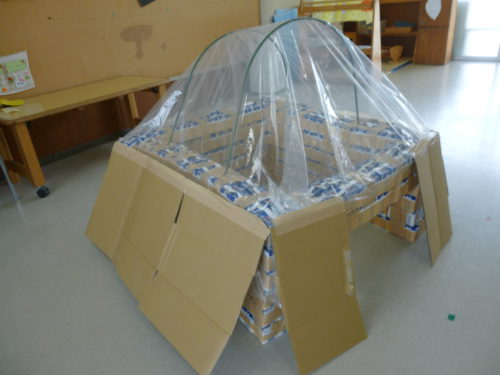 こいぬ組では、宇宙をテーマにうたやダンスをすることを伝えた際、こどもたちから「UFOに乗ってみたいな♪」という話がありました。そこで、牛乳パックのUFOをみんなで作ることにしました。試行錯誤しながらもUFOが完成すると、大喜びでUFOに乗り込んでいました。