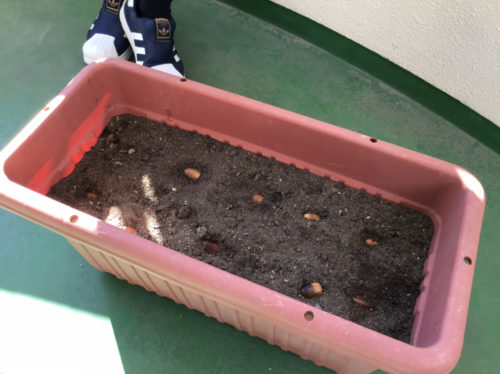 図鑑を見ながら植え方を知り、水に浸けて沈んだものが芽が出るどんぐりだと知ると、実際に植えてみたくなったようで、プランターに植えて育てていくことにしました。どんぐりから出ていたものは芽なのか根っこなのか、これからも観察が続きそうです。