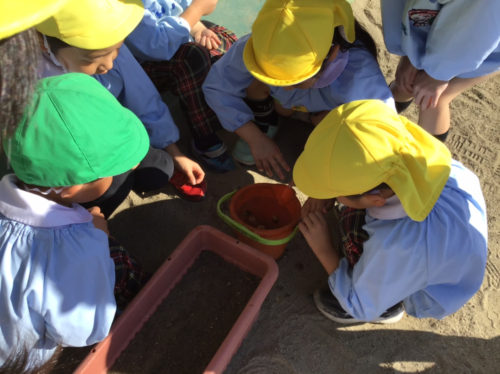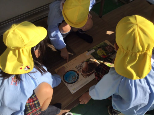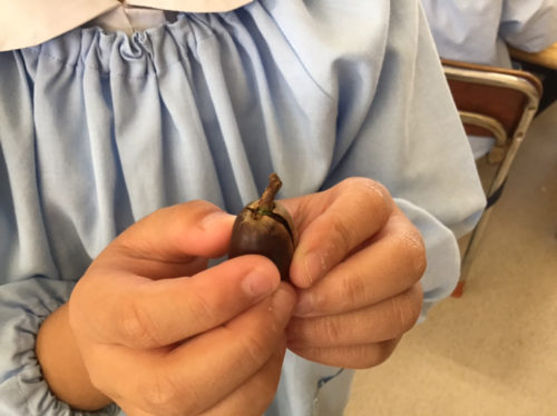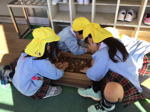 ひかり組では、昨日寺岡中央公園で拾ったどんぐりを観察しながら「なかから幼虫が出てきた」「芽みたいなのが出てるね」「中身はおいしそうだね」など、様々な発見を楽しんでいました。