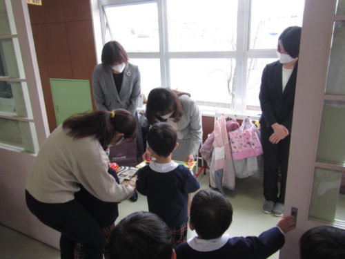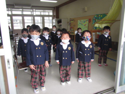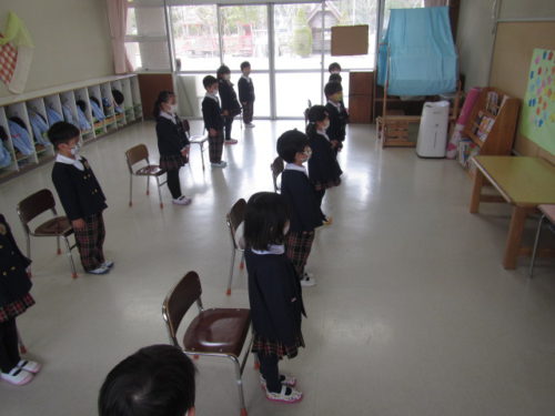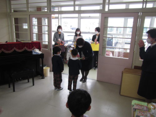修業式では、これまでの園生活を振り返り、一年間で成長した姿について園長先生からお話をいただきました。こどもたちは、4月からの新しいクラスで友達と過ごすことを楽しみに式に参加していました。離任式では、3月いっぱいで園を離れる先生方との別れを惜しみつつも、感謝の気持ちをもって、「ありがとうの花」を歌ったり、こどもたちが作ったプレゼントを渡したりしました。