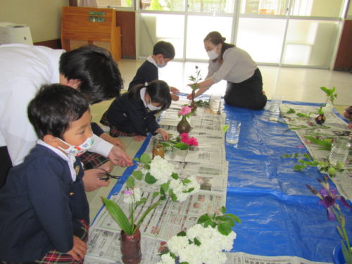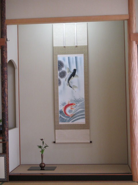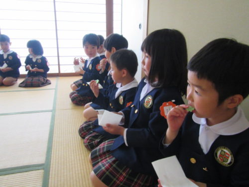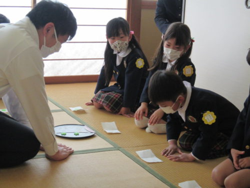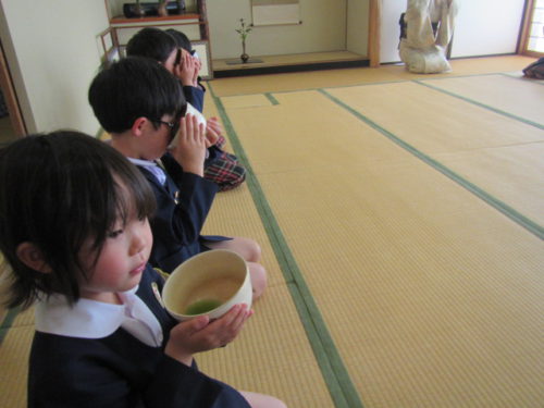こどもの国幼稚園の年長組では、茶道の時間を行いました。茶室での作法や床の間のお軸「鯉の滝登り」の話を聞いたり、お菓子やお茶のいただき方を教えていただいたりしました。こどもたちは、「お先に」「どうぞ」のあいさつをして、じっくりと味わいながらお菓子をいただいたり、茶碗の持ち方に気を付けながらお茶をいただいたりしていました。茶道の時間が終わってからも「お花やお軸が綺麗だったな」「次はどんなお菓子かな?」と期待が高まっている様子でした。
