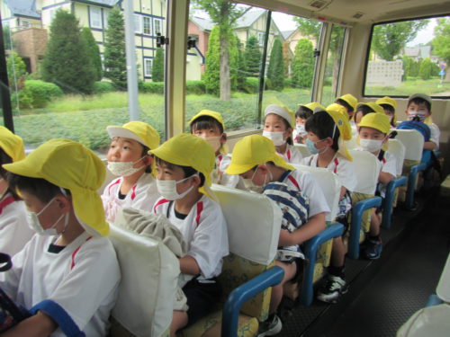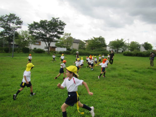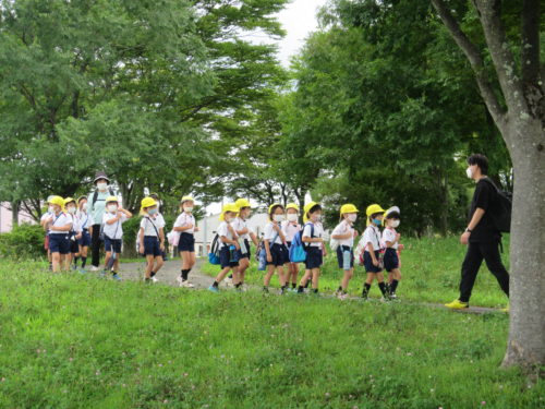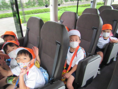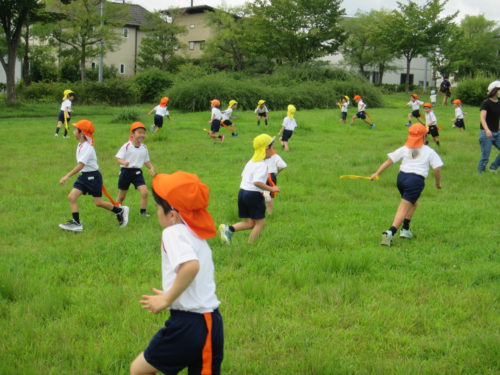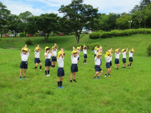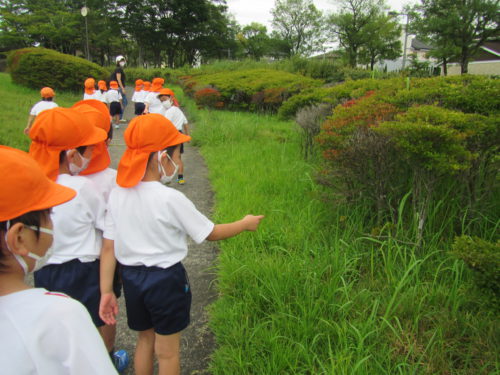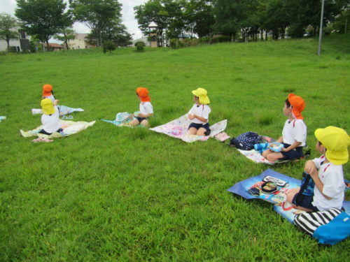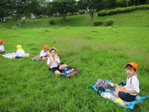 今日は、こどもの国幼稚園の年長組で、幼稚園バスに乗って紫山公園に行って来ました。散策中、「色々な花が咲いてて綺麗だね。」「虫や鳥の鳴き声が聞こえるよ。」などと、自然に興味をもって楽しんでいる様子が見られました。また、「やっぺぇ!たいそう」をしたり、「しっぽ取りゲーム」をしたりして、身体を大きく動かしました。自然の中で楽しく遊んだ後は、レジャーシートを敷いて、昼食をいただきました。こどもたちは、青空のもと友達と美味しく昼食をいただき、楽しい時間を過ごしました。これからも、園外に出て様々な場所で、自然や季節を感じられるようにしていきます。