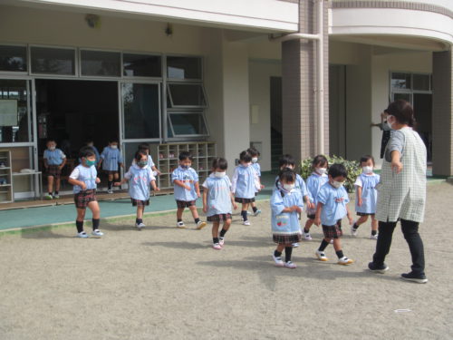 今日はこどもの国幼稚園で地震避難訓練がありました。『お(押さない)・は(走らない)・し(しゃべらない)・も(戻らない)』の約束を守りながら落ち着いて避難していました。