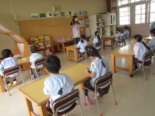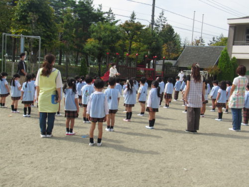 園庭に避難した後、園長先生から大切なお話をいただき、こどもたちは真剣に話を聞いていました。