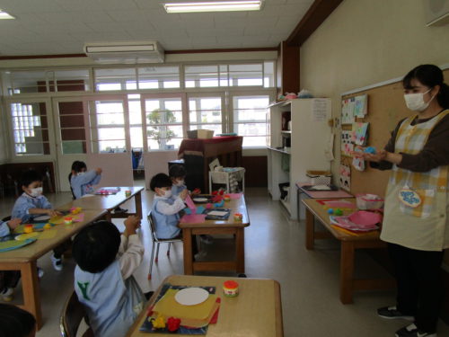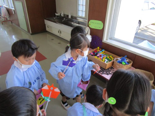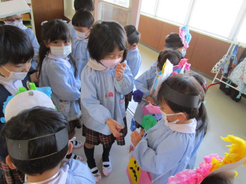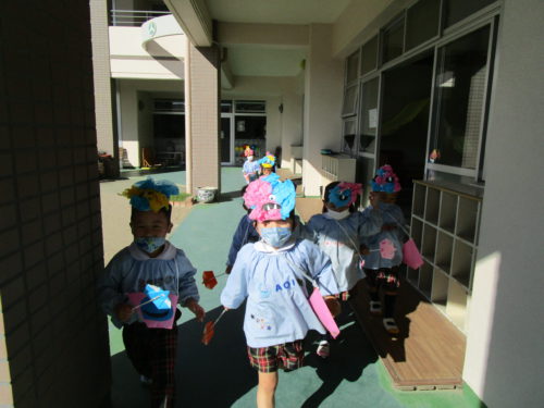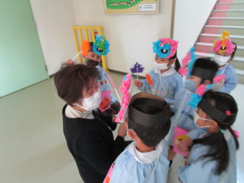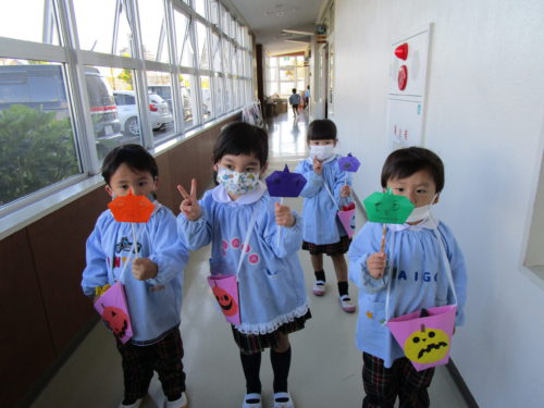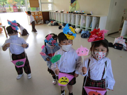 こひつじ組で教育実習している先生とは、カラフルなモンスターのお面も作りました。仮装をして、園舎内のいろいろな場所に出かけ、「トリックオアトリート」と話しながらキャンディー集めを楽しんでいます。