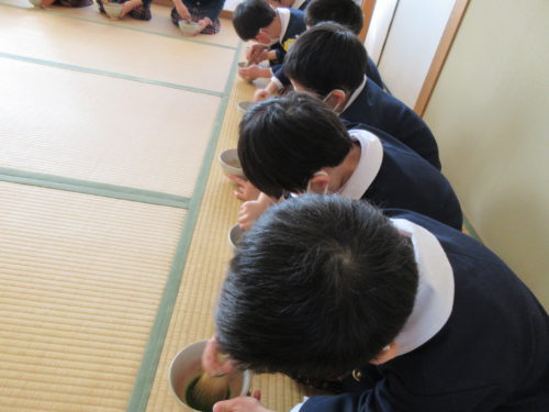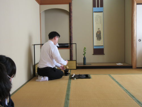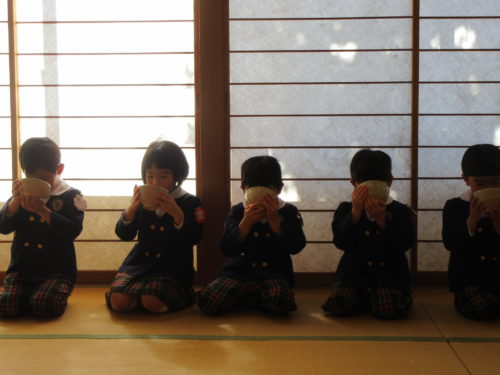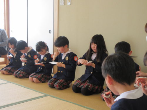 こどもの国幼稚園の年長組で今年度最後の茶道の時間を行いました。二月は利休様の命日の月ということで、担任が献茶を行いました。今回は、これまでのお軸やお菓子、茶道の時間について振り返りながら、茶道でお世話になった人たちやお道具などに、ありがとうの気持ちをもって参加しました。こどもたちからは「茶道を教えてくれた先生にありがとう。」「お茶室にありがとう。」「花を持ってきてくれた人にありがとう。」などと、それぞれに感じた感謝の気持ちを伝え合っていました。また、実際にお釜から汲んだお湯でこどもたちは自分でお茶を点て、いただきました。「泡がたっていい匂いだね。」「自分で立てたお茶はおいしいね。」とこどもたちは自分で点てた特別なお茶に大満足でした。茶道の時間で教わった思いやりの心や感謝の気持ちを大切にしてこれからも過ごしていきます。