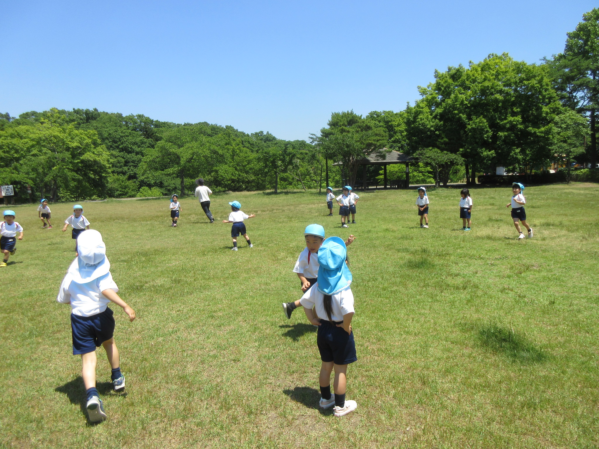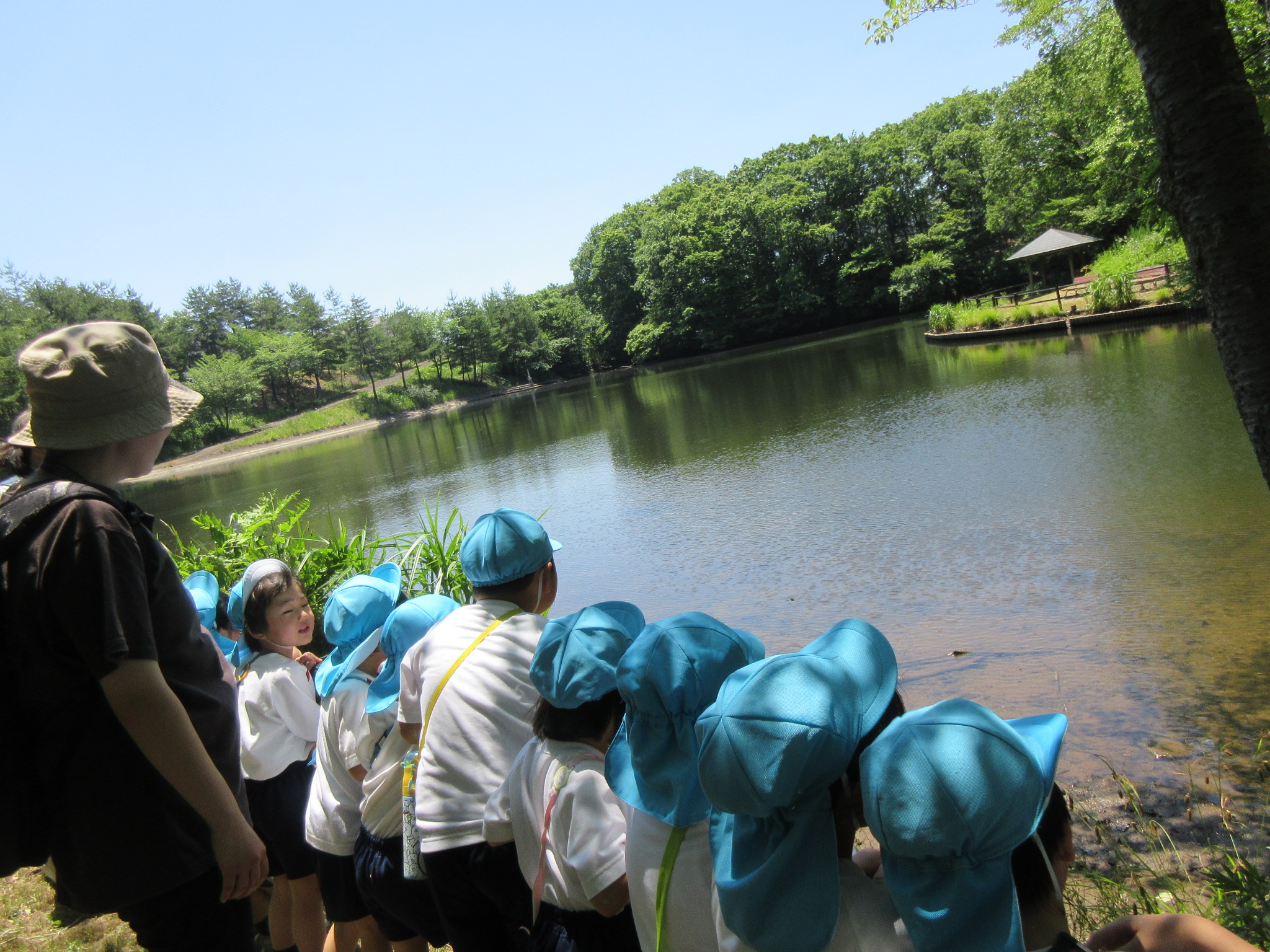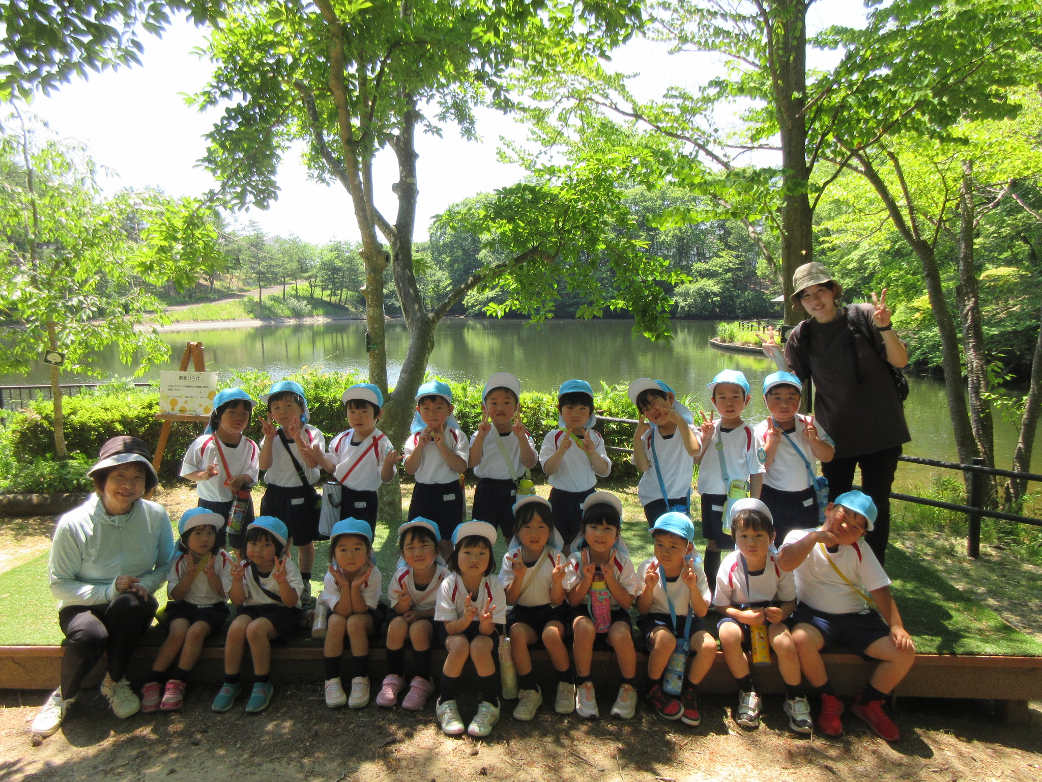 こどもの国幼稚園の年中組では、高森東公園に出かけてきました。年中組になって初めての園外保育にこどもたちは「バスに乗るんだよね!」「公園で鬼ごっこをしよう!」と期待を高めていました。公園に散策をすると大きな鳥や魚、珍しい色のとんぼを見つけるとこどもたちからは「わぁ!」と歓声が聞かれ、「なんて名前なんだろう?」と話題が上がりました。また広場で鬼ごっこも楽しみました。お弁当は園に戻り、年長組さんと一緒にいただきました。こどもたちからは「楽しかった!」と感想があり、来週のさつまいも畑の草取りにも期待を高めているようです!