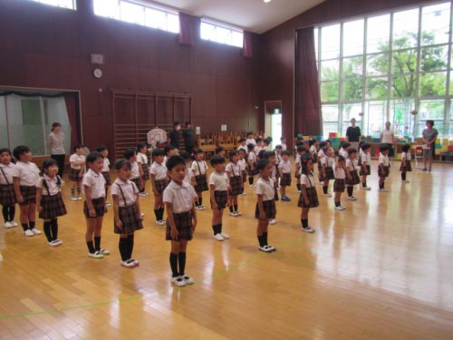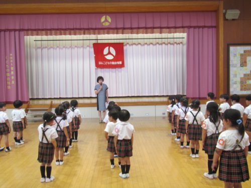 今日はこどもの国幼稚園で1学期の終業式がありました。ホールに集まり、 園歌やヤッホッホ夏休みを歌ったり、園長先生のお話を聞いたりしました。園長先生から「自分でできることがたくさん増えましたね。」「お友達を誘いたくさん遊びましたね。」「困っているお友達を助けていましたね。」などと褒めていただき、こどもたちはとても嬉しそうでした