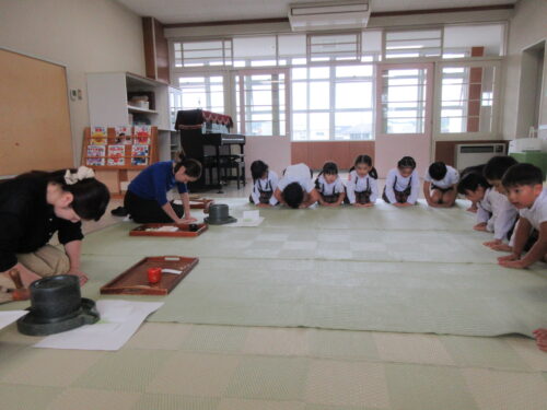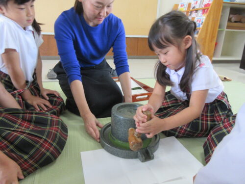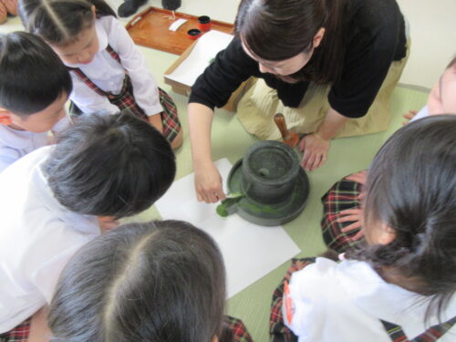 挽いた抹茶は、次回の茶道の時間でいただきます。こどもたちは「どんな味かな?」「おいしいかな?」と話し、期待をもっているようでした。