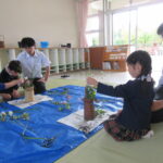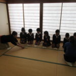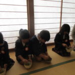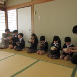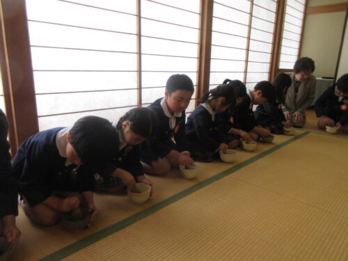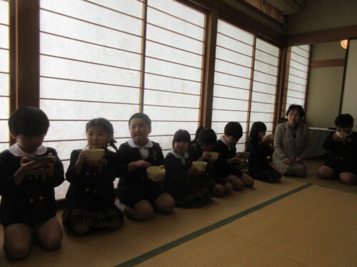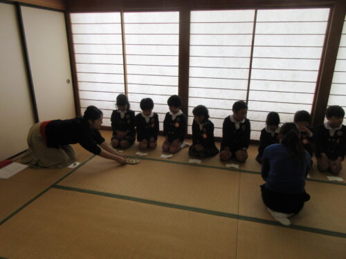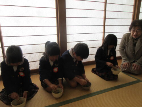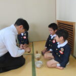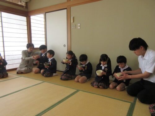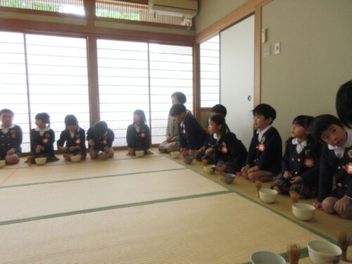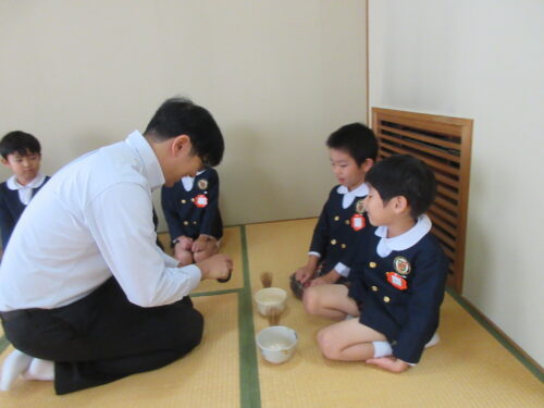 こどもの国幼稚園の年長組で茶道の時間を行いました。先日の石臼体験で挽いた抹茶を使い、自分でお茶を点てるということで、こどもたちは今日の茶道の時間を楽しみにしていました。茶筅を上下に素早く動かすことを教えていただき、「おいしくなあれ!」の気持ちを込めてお茶を点てることに挑戦しました。自分で点てたお茶をいただくと、「抹茶の良い匂いがするね!」「泡ができて美味しい!」と満足そうな表情を浮かべていました。12月の茶道の時間では、お家の方にこどもたちが心を込めてお茶を点てますので、楽しみにしていてください。