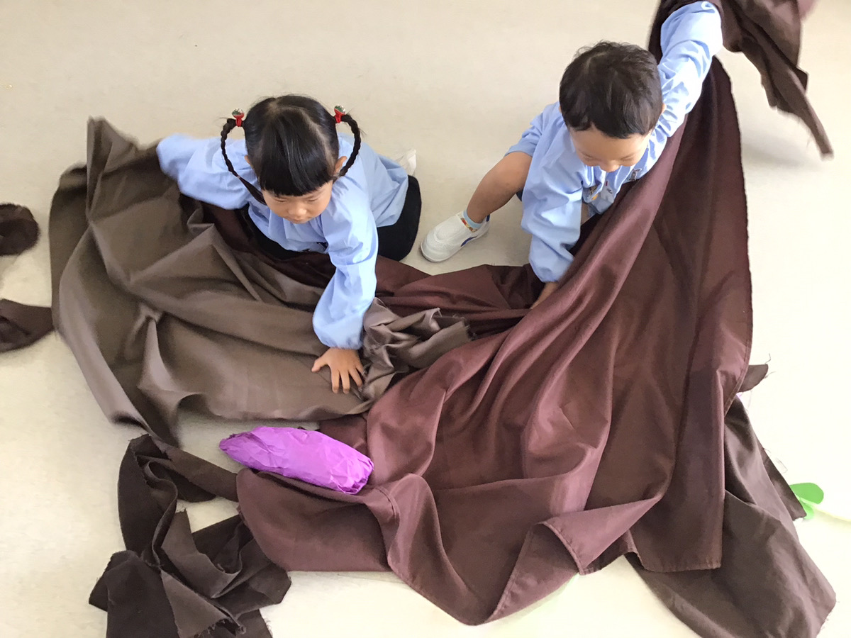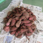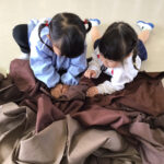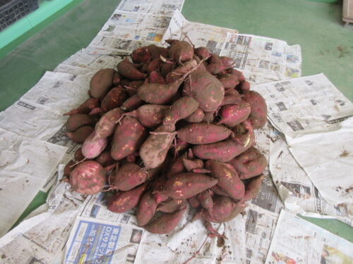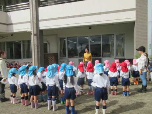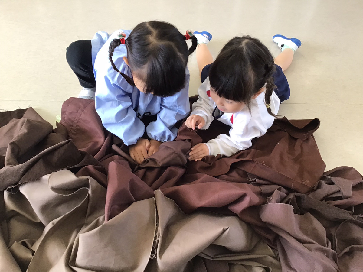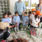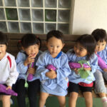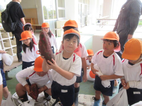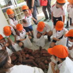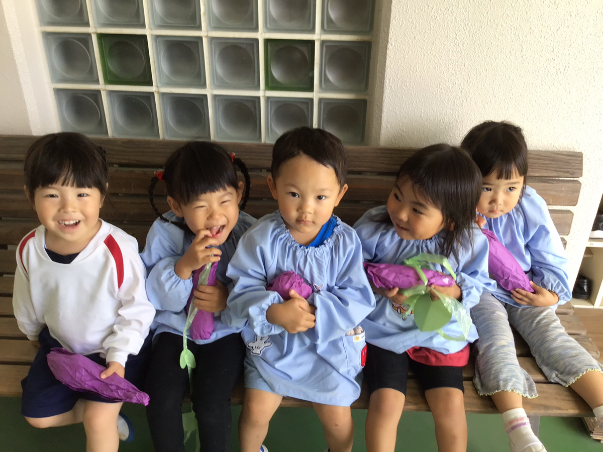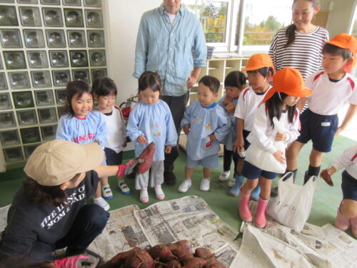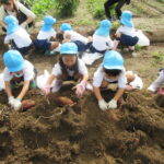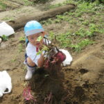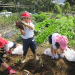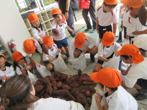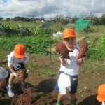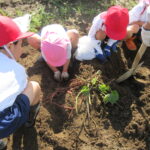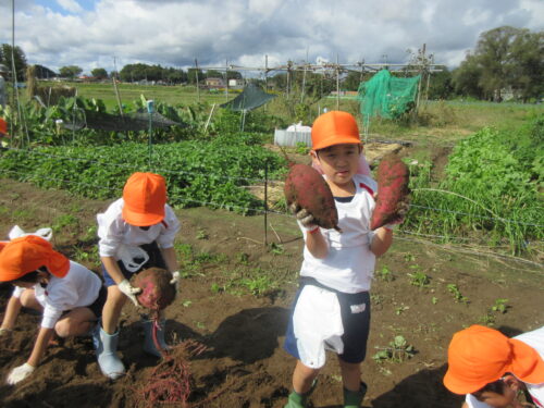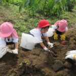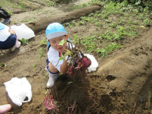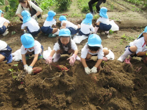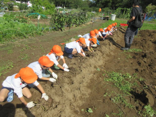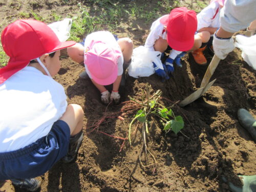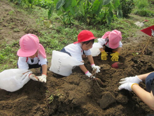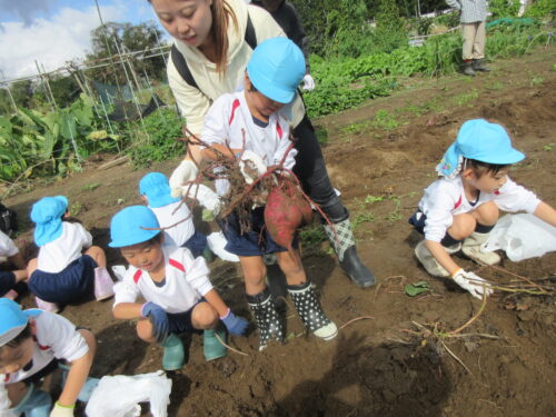 こどもの国幼稚園でさつまいも掘りに行ってきました。今日まで年長組が苗を植え、年中組が草取りをし、年少組が観察をしてみんなで大切に育ててきたため、こどもたちは収穫することをとても楽しみにしていました。畑に着いてさつまいも掘りが始まると、こどもたちは一生懸命土を掘り、さつまいもが見えてくると「あった!もう少しで採れそうだよ」と励まし合いながらたくさんのさつまいもを採っていました。中にはとても大きなさつまいもがあり、驚いたり喜んだりする様子も見られました。満三歳児のひよこ組は保育室でさつまいも掘りごっこを楽しみました。本日採れたさつまいもは31日に行うやきいも会でいただく予定となっています。さらに期待を高めながら観察をしていきます。