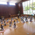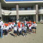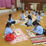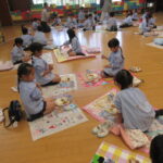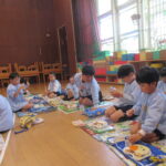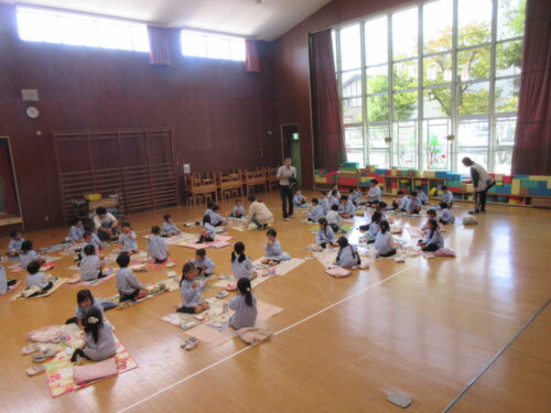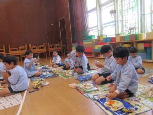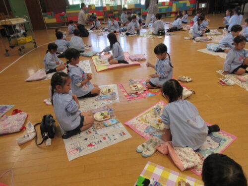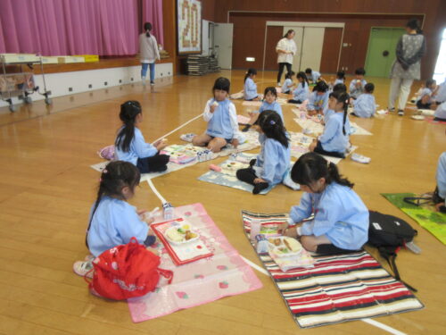 昼食はホールでシートを広げて食べました。年下の友達の準備を手伝ったり、片付けの仕方を教えてあげたりする姿も見られ、とても良い経験となりました。