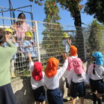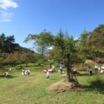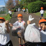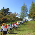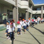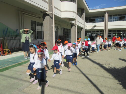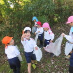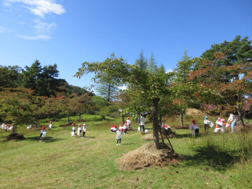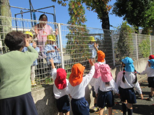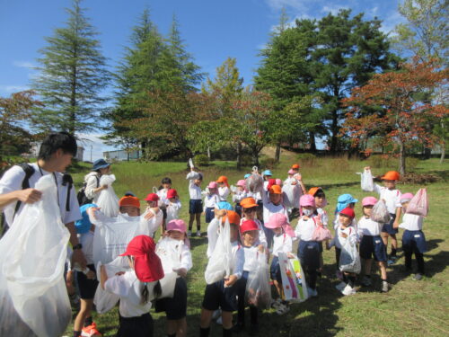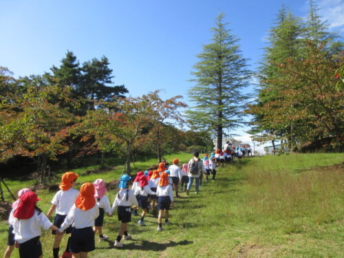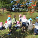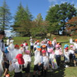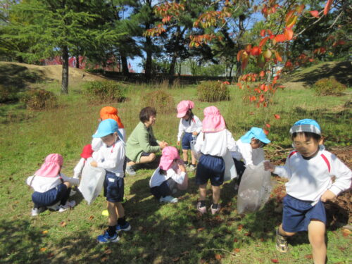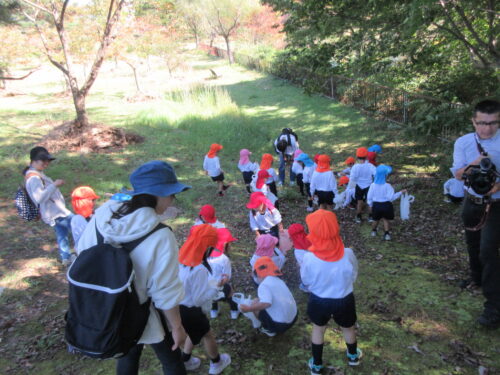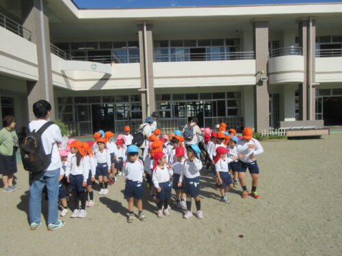 さわやかな秋晴れの中、年少中長組のこどもたちが、縦割りのグループごとに手を繋いで寺岡中央公園に落ち葉拾いに出かけてきました🍂
