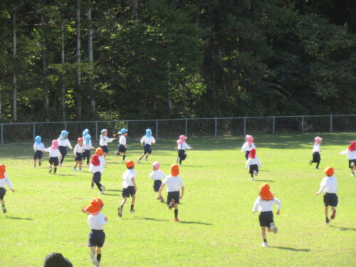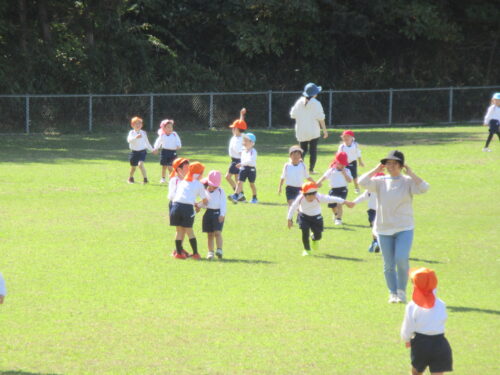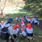 たくさんの落ち葉を拾いながら「こんな形の見つけた」「葉っぱに穴があいてる」「こんなに拾ったよ」と、友達同士で見せあうことも楽しんでいました。たくさん拾った後は、広い原っぱで鬼ごっこをしたり、公園を散策したりして秋の自然を感じながら身体をたくさん動かしました。