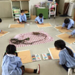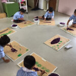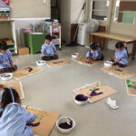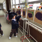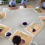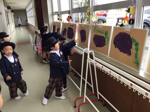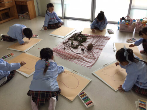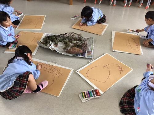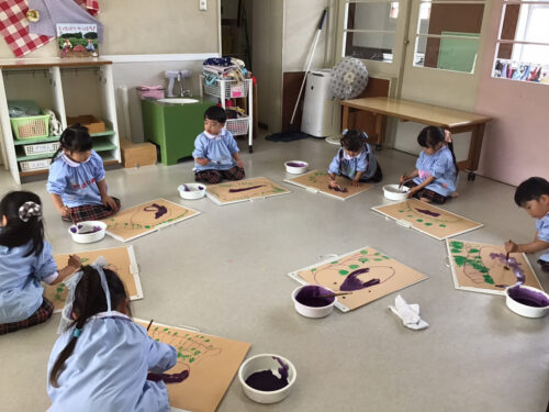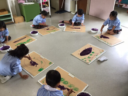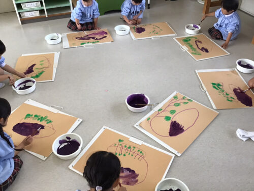 こどもの国幼稚園の年少組では、先日掘ったさつまいもの観察画を描きました。クレパスで芋の輪郭を描き、絵の具で塗りました。「つるは紫色だ!」「おいもはちょっと茶色いね」など、様々な発見をしながら描き、完成したお芋の絵はどれも美味しそうでした。