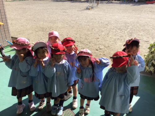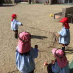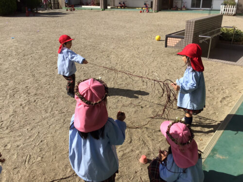 絵を描いた後は、つるでリースや冠などを作ったり、縄跳びにしてみたりしながら遊びました。「お芋のプリンセスだよ」「つるもさつまいもの匂いがする」と話しながら楽しく遊びました。