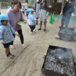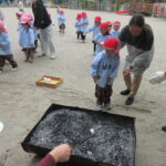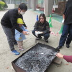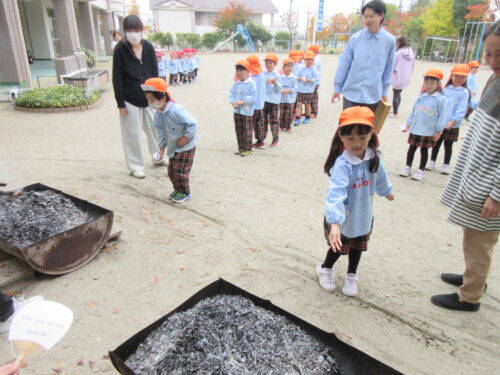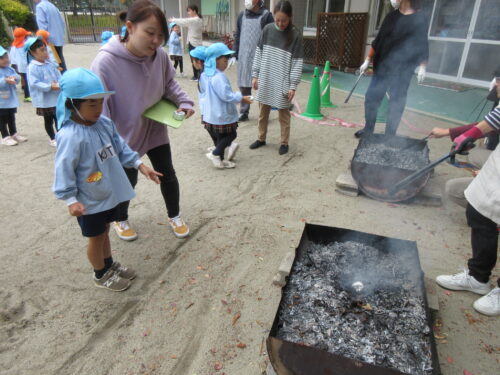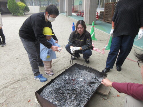 落ち葉を焚いたところに一人一人さつまいもを入れると「上手に入れられたよ」「おいしくなりますように」とやきいもが出来上がることを心待ちにしていました。