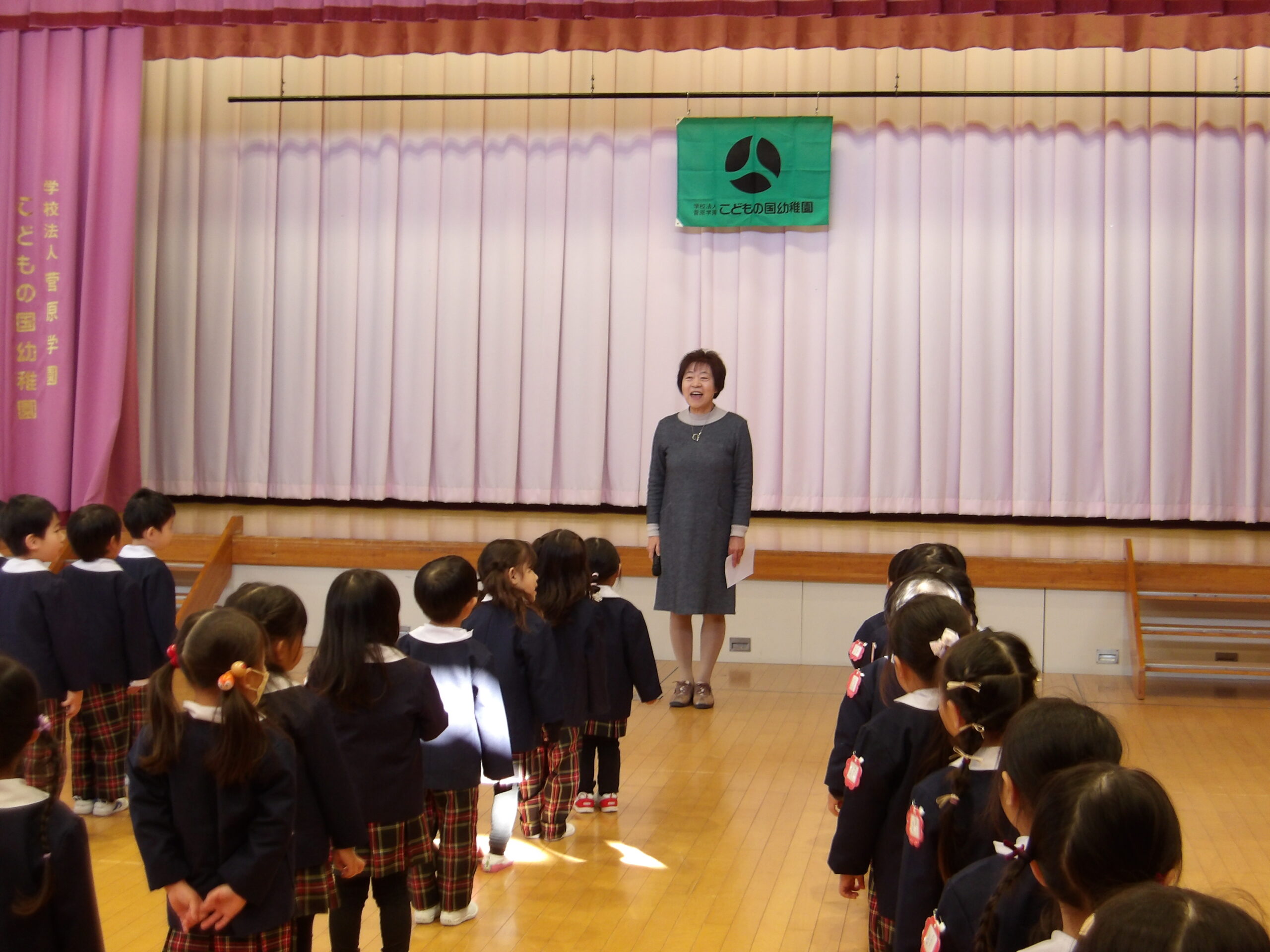 こどもの国幼稚園で三学期始業式を行いました。先生や友達と新年のあいさつを交わし、冬休みの楽しかった思い出を話したり、広い園庭で思い切り身体を動かして嬉しそうに遊んでいました。始業式では、園歌を歌ったり、園長先生のお話を聞いたりしました。また代表児は「冬休み楽しかったこと」や「三学期に頑張りたいこと」を大きな声で発表しました。三学期も、豆まき会やもちつき会など行事も楽しみながら様々なことに挑戦できるようにしていきます。