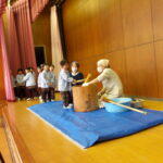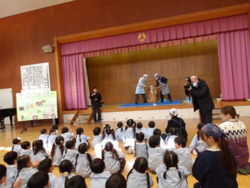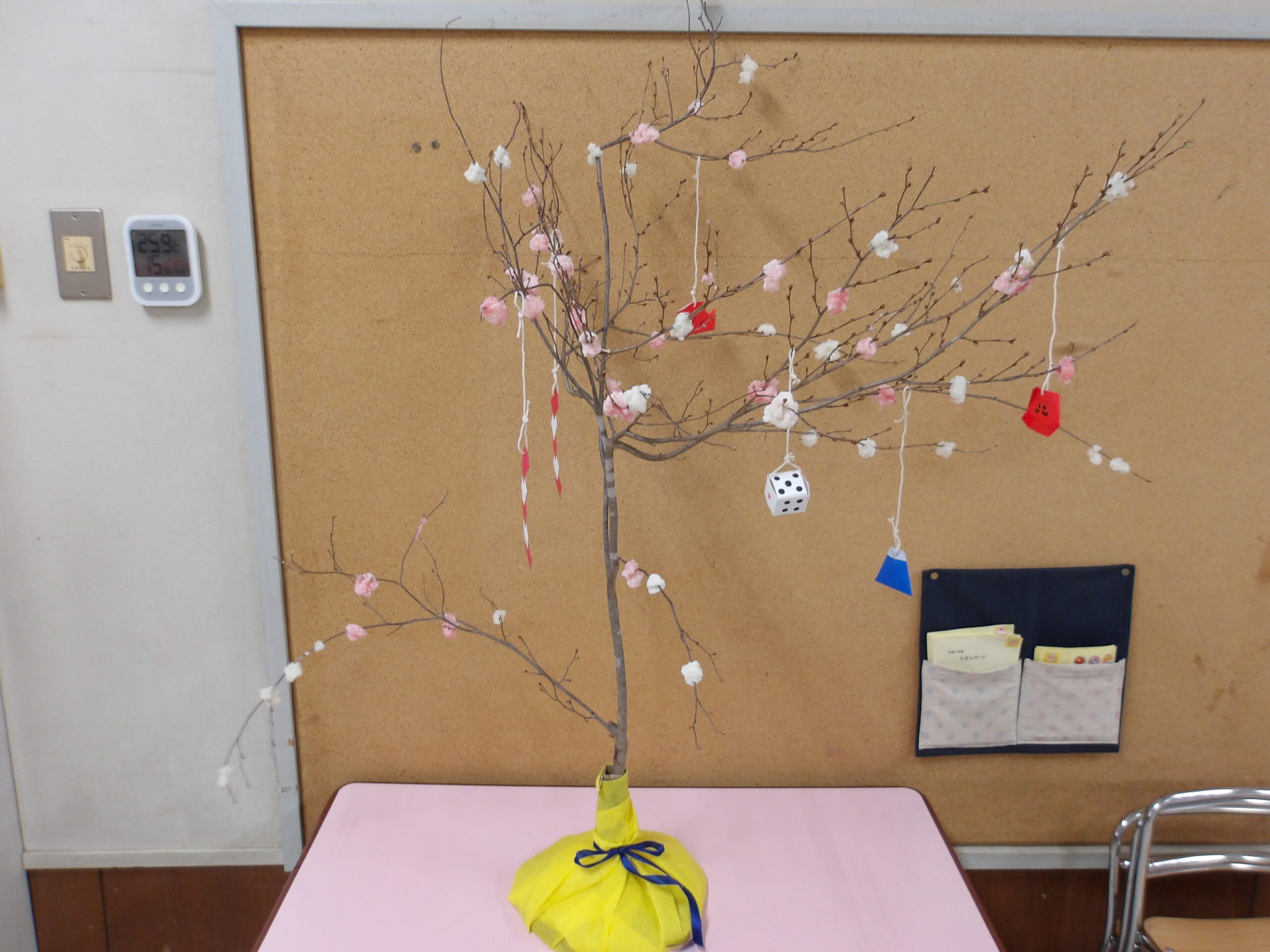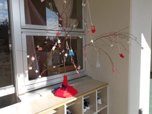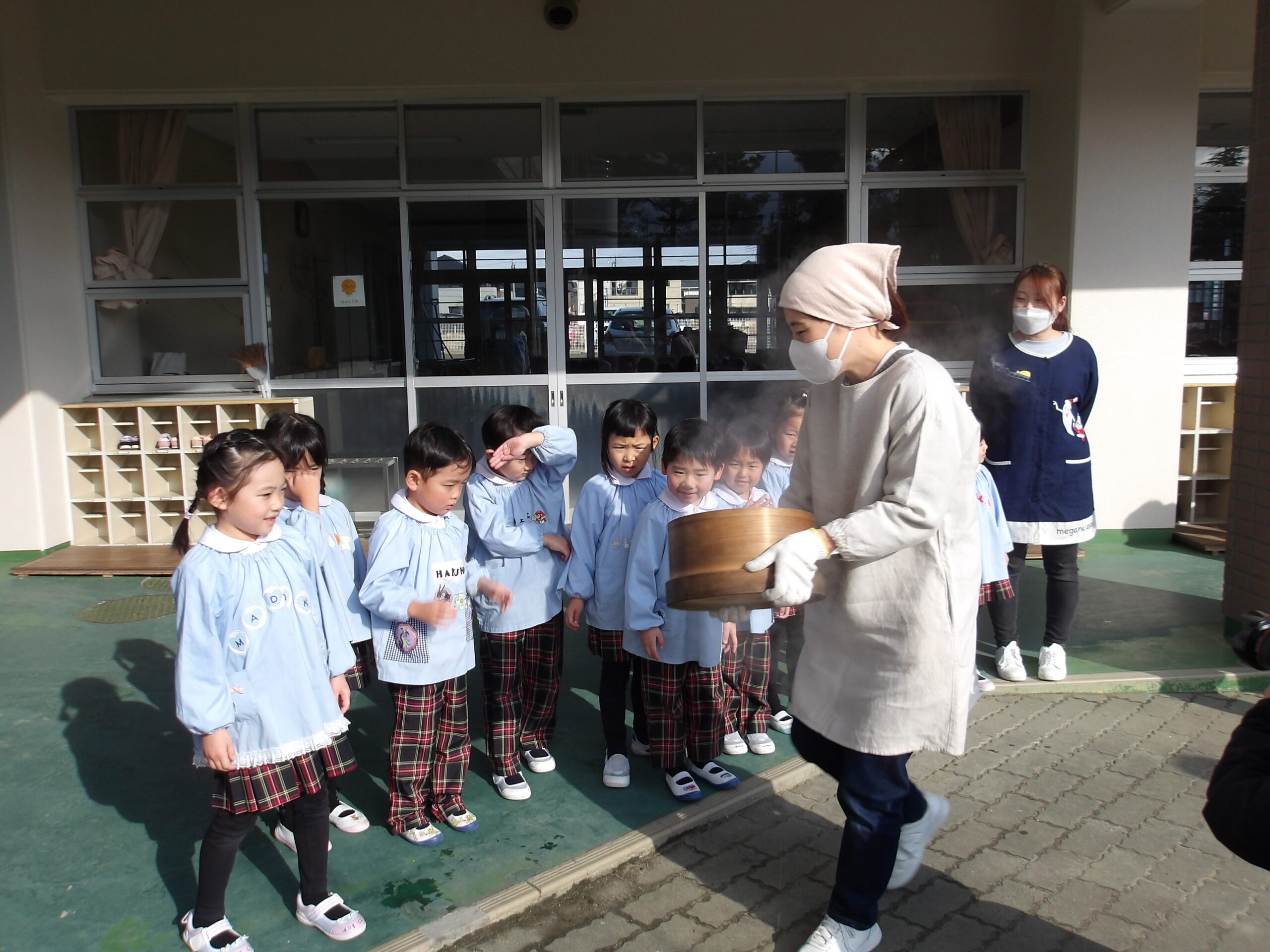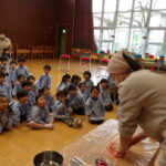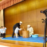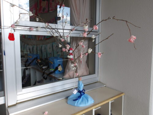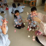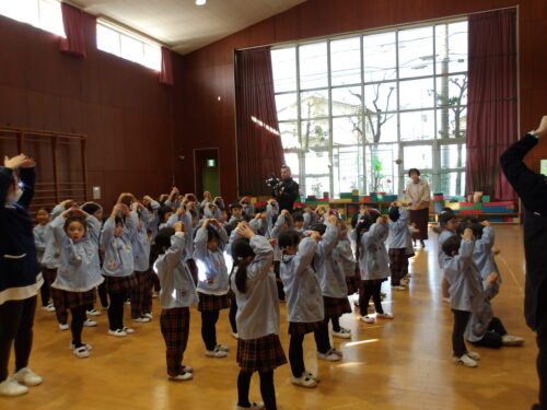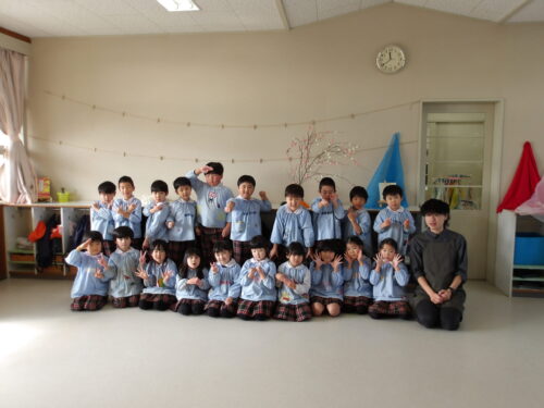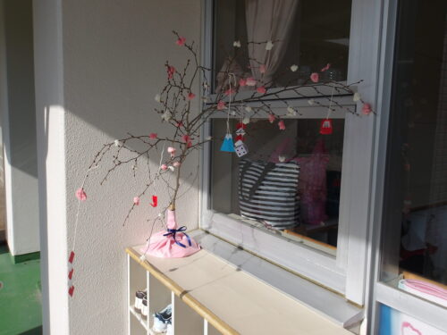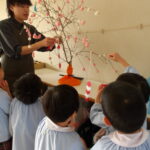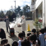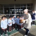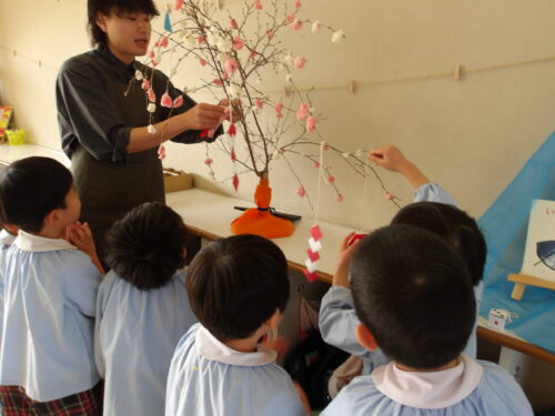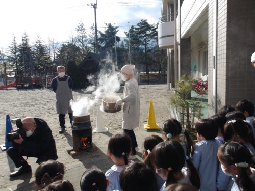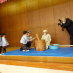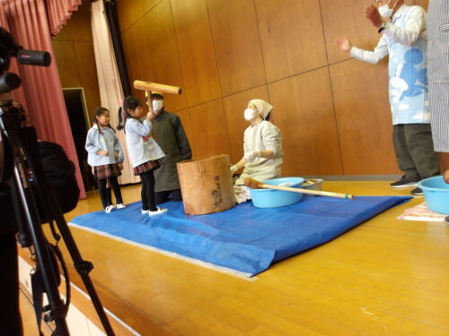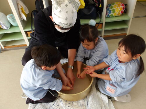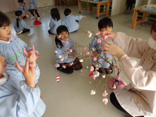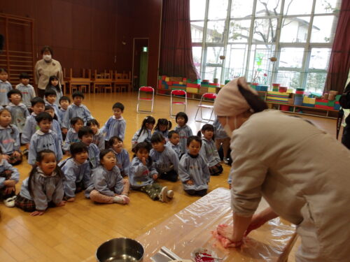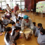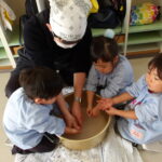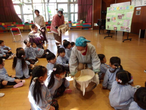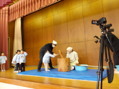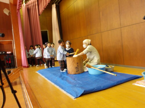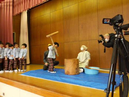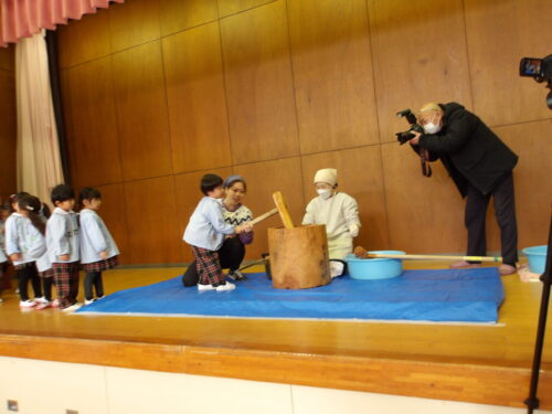 こどもの国幼稚園でもちつき会がありました。こどもたちが登園すると、もち米から蒸している様子を見て、「早くもちつきしたいな」と期待をもつ様子が見られました。もちつき会では、うたを歌ったり一人ずつ力を込めてもちをついたりしました。また、出来上がったもちで団子さしを作り、こどもたちは色付けをしたもちを見ると「ピンク色だ!」と喜んだり、水木につける際には「少し難しいな」と話しながらも丁寧にもちをつけたりしていました。今年も一年みんなが元気に過ごせますように♫