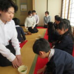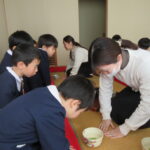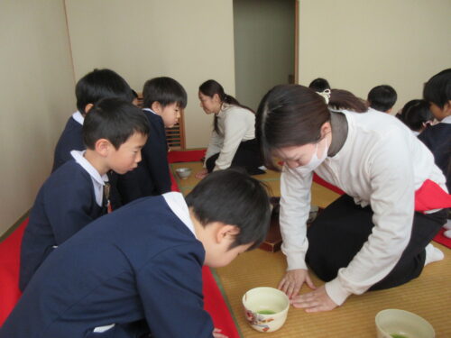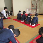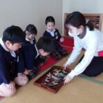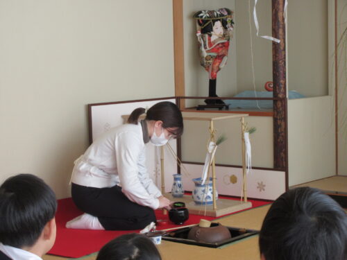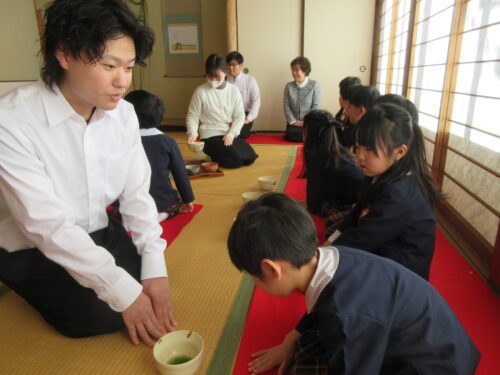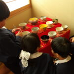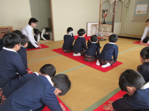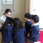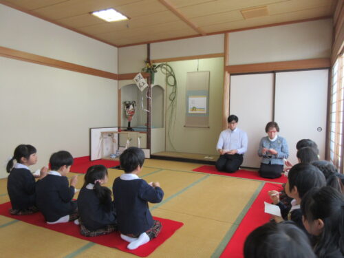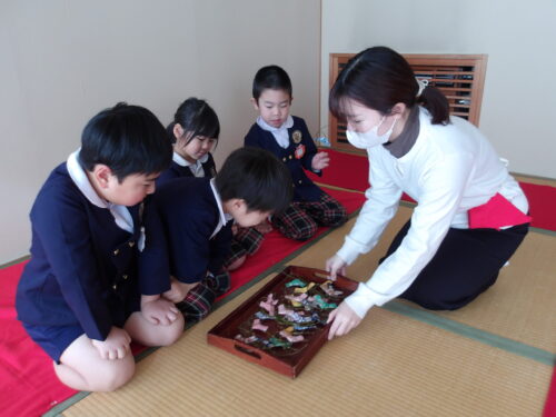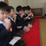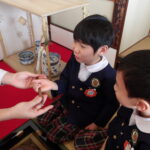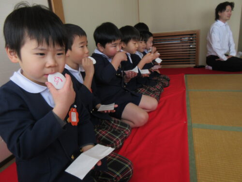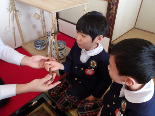 こどもの国幼稚園の年長組で、新年を祝う茶会「初釜」を行いました。こどもたちは普段と違う茶室の雰囲気の中で先生のお点前を真剣に見たり、正客と亭主の問答をよく聞き問いかけに答えたりしていました。また、初釜が終わった後には、結び柳のおみくじを引いたり、お道具や床の間の飾りを近くでじっくり見たりしていました。本日、茶道の時間の思い出を描いた懐紙と結び柳のおみくじを持ち帰りました。ぜひ、柳を水につけて成長を楽しんでみてください。