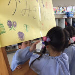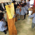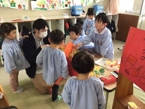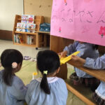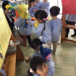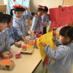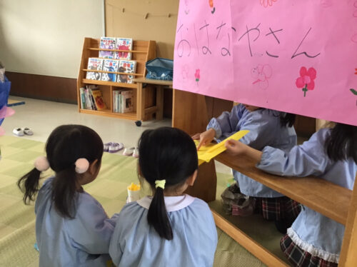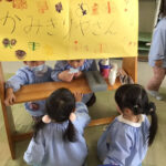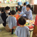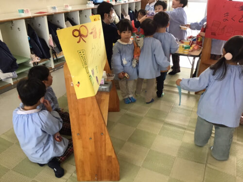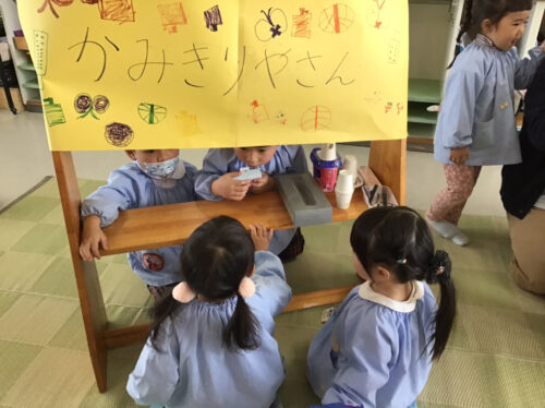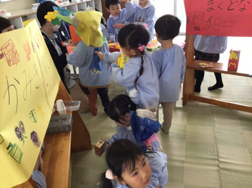 うみ組がマクドナルドやさん、髪切りやさん、クレープやさん、ゲームやさんなどの様々なお店を開き、ひよこ組さんを招待しました。「何が欲しい?」「これください」「どうぞ」などと、うみ組のこどもたちがひよこ組さんに優しく声をかけながらかかわりを楽しんでいました。