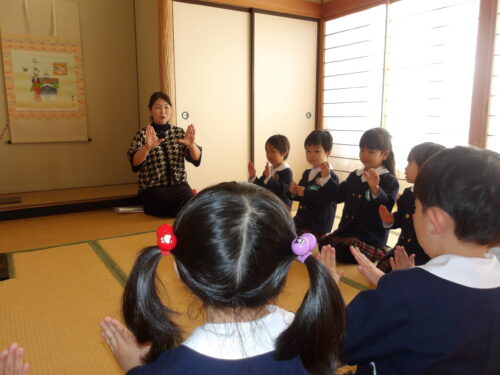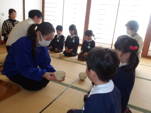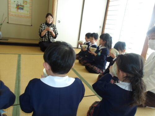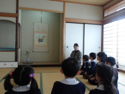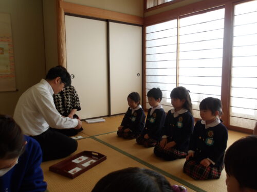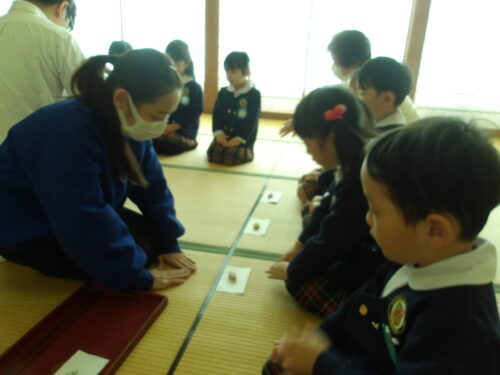 本日、こどもの国幼稚園年中組が初めての茶道の時間に参加しました。