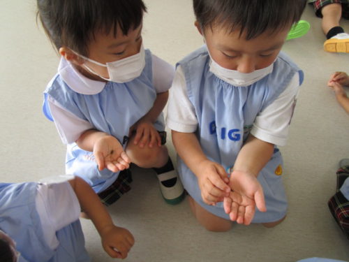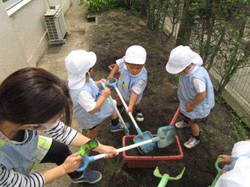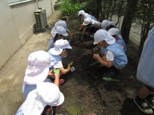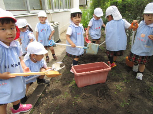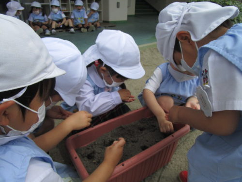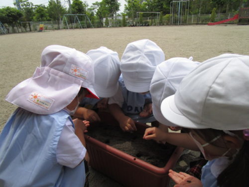 こどもの国幼稚園の年少組では、先日ミニひまわりの種をプランターにまきました。みんなで畑の土をプランターに入れたり、図鑑を読んだりして準備をし、「砂と土は色が違うね」「ミニひまわりの種は黒いんだね」と様々な発見を楽しんでいました。