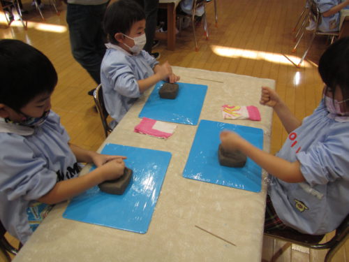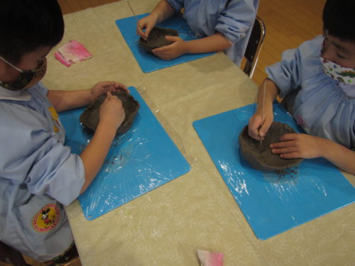 「土粘土を初めて触ったよ」と話すこどもが多く、土粘土を触ることや陶芸体験することをとても楽しみにしていました。実際に触ってみると、「やわらかい!」「僕たちの粘土と違うね。」と話し、土粘土の感触を楽しんでいました。こどもたちは思い思いに形を作り、竹串で絵や模様などを描いていました。少吉郎先生への質問タイムでは、作品が完成するまでの期間がどの位かかるのかや、これまでに作った作品の中で1番大きいものは何かなどの質問をして陶芸への興味を深め、自分の作品が完成することへの期待を高めていました。