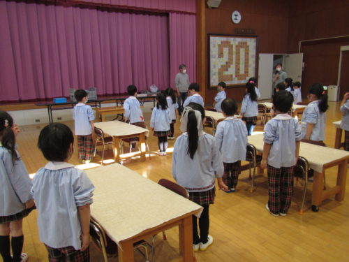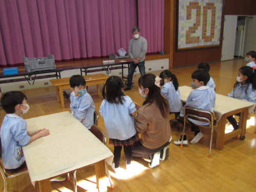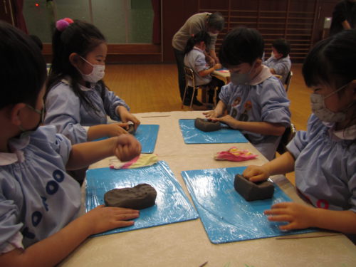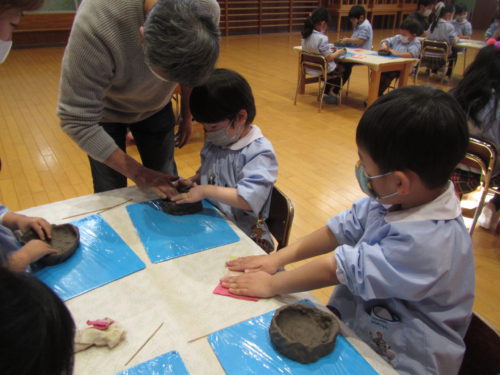 こどもの国幼稚園の年中組で、進級記念製作を行いました。村田町から陶芸家の古山少吉郎先生をお招きして作り方を教えていただき、土粘土で茶碗やお皿を作りました。