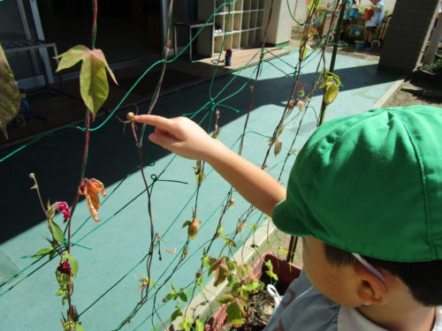 こどもたちが大切に育ててきた朝顔から種を収穫することができました。こどもたちは、「スイカの種に似ているね。」「大きい種があったよ!」などと話し収穫した種をよく観察していました。また、「来年も朝顔の種をまきたいね。」と話し、来年へ期待を膨らませている幼児もいました。